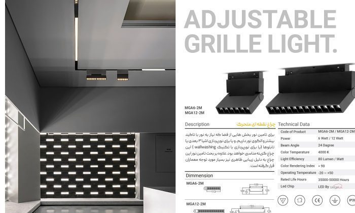 چراغ های مگنتی ال ای دی شعاع یکی از به روزترین سیستم های روشنایی است.ولتاژ کاری در کل طول مسیر ریل ۴۸ ولت جریان مستقیم است که نسبت به سیستم های متداول با جریان متناوب ۲۲۰ ولت بسیار ایمن است. چراغ های مورد استفاده در این سیستم مانند چراغ های خطی، چراغ ها موضعی و … با نیروی مغناطیسی و ساختار مکانیکی روی ریل ثابت می شوند و به راحتی می توان آن ها را درون ریل حرکت داد. این سیستم قابلیت نصب به صورت توکار داخل سقف کاذب مانند سقف های کناف، به صورت روکار و آویز را دارد.این ویژگی سیستم چراغ های مگنت یا مولتی ترک را برای فضاهای مسکونی، اداری، فروشگاهی، هتل ها، موزه ها، گالری های هنری و … مناسب می کند. چراغ نقطه ای متحرک شعاع با جنس بدنه آلومینیوم با ولتاژ48 ولت و توان مصرفی 6 وات قابل سفارش می باشد و امروزه از این چراغ ها برای تامین نور بخش هایی از فضا که نیاز به نور با تاکید بیشتر و الگوی نور داریم و یا برای نورپردازی اشیا ۳ بعدی یا تابلوها (یا برای نورپردازی با تکنیک wallwashing ) این چراغ گزینه مناسبی خواهد بود.علاوه بر بحث تامین نور این چراغ به دلیل زیبایی ظاهری نیز بسیار مورد توجه معماران قرار گرفته است.